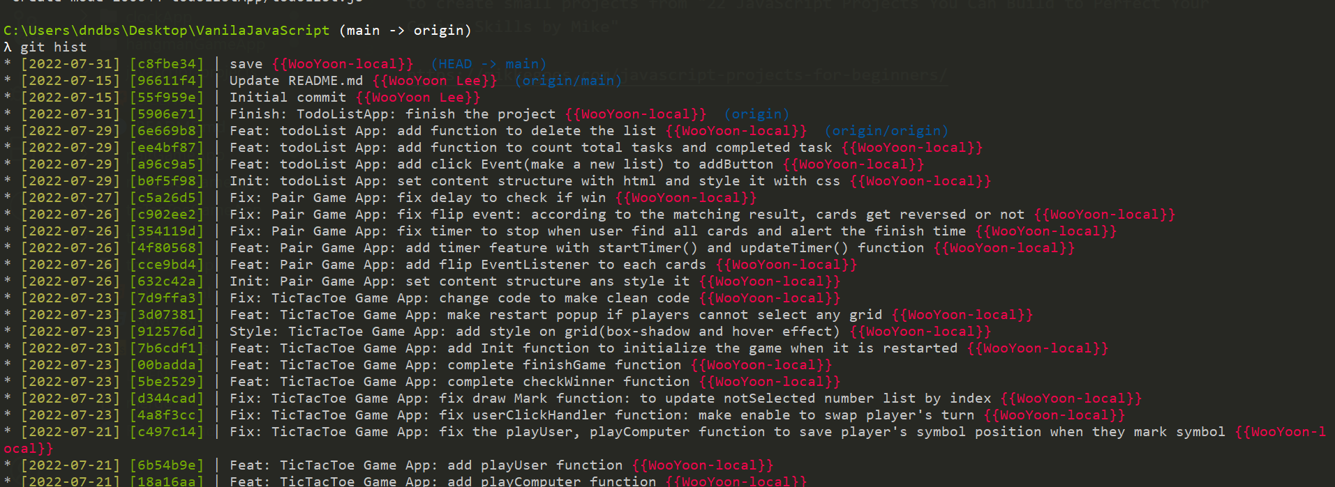 (origin/main) 커밋 뒤에 커밋 약 15개, 그리고 (main), (origin/origin) 커밋, 바로 하나 뒤에 (origin).