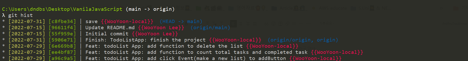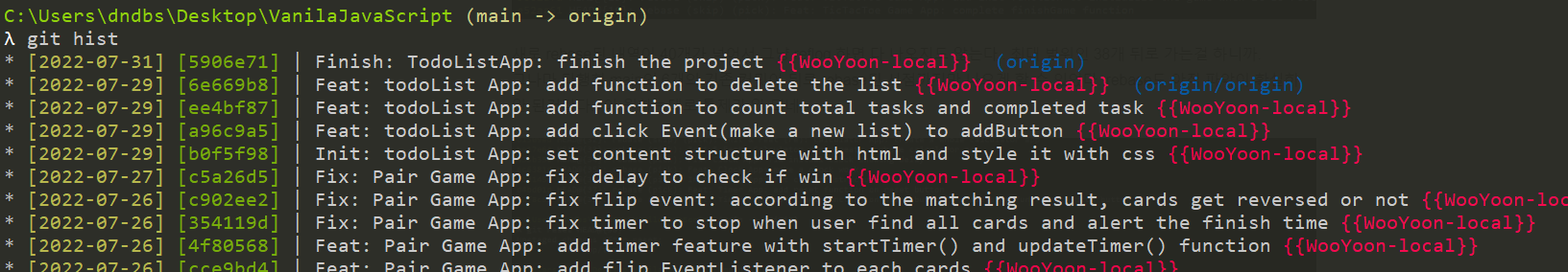 orgin 브랜치도 확인해보면 아까아까 만든 "Finish: todolist ...."커밋을 이제야 정상적으로 push가능했어서 잘 들어온 것을 확인할 수 있다.