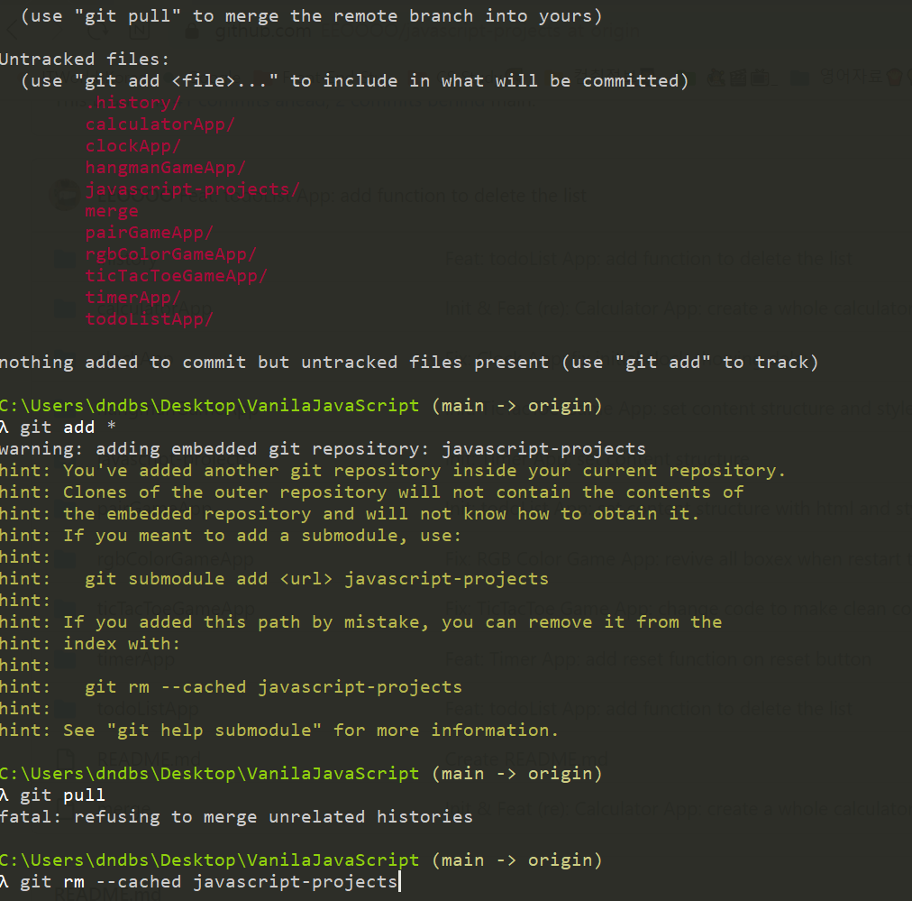 하나하나 해결해가는데 진짜 살 떨린다. 흑흑.. 나름 브랜치 갈라지고 합쳐지는 지점 이해하고 개념 검색하고 이해해가면서 하는데, 작업물 날아갈까봐 마음 속으로 울면서 하고 있다.