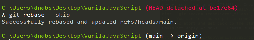 3. 그 다음 git checkout main으로 이동함. (HEAD -> origin 에서 HEAD-> Main이 됨.)