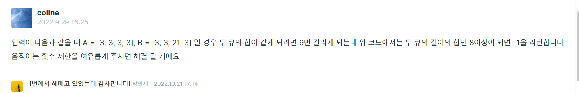 각 큐의 길이 더해주고 1만 추가로 더했는데 그걸 10 더하는 걸로 바꾸니까 통과되었다.